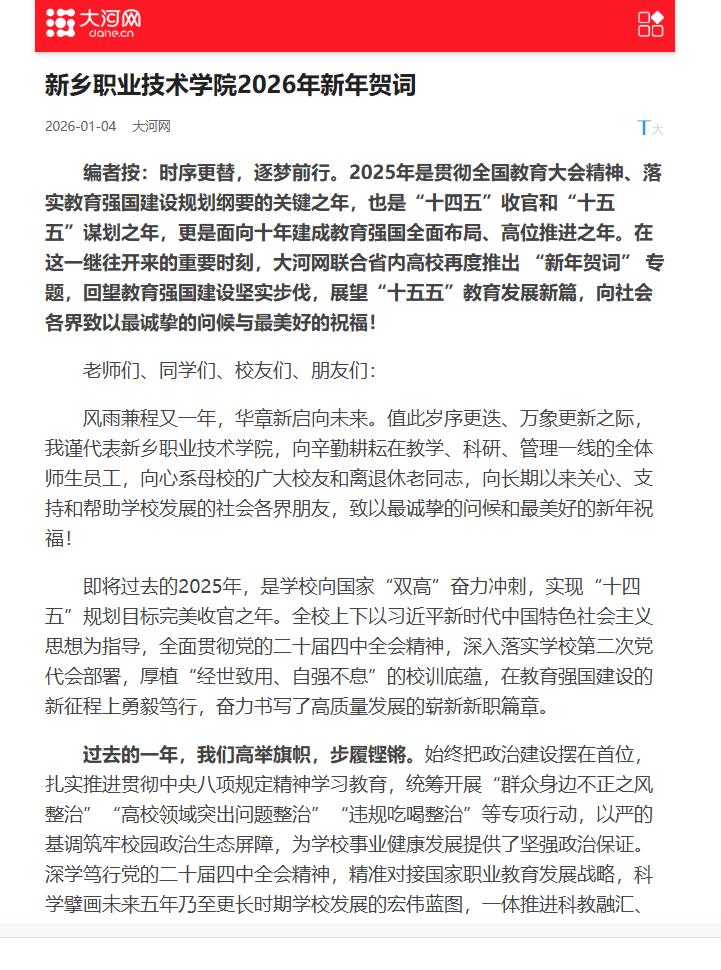 【大河网】新乡职业技术学院2026年新年贺词