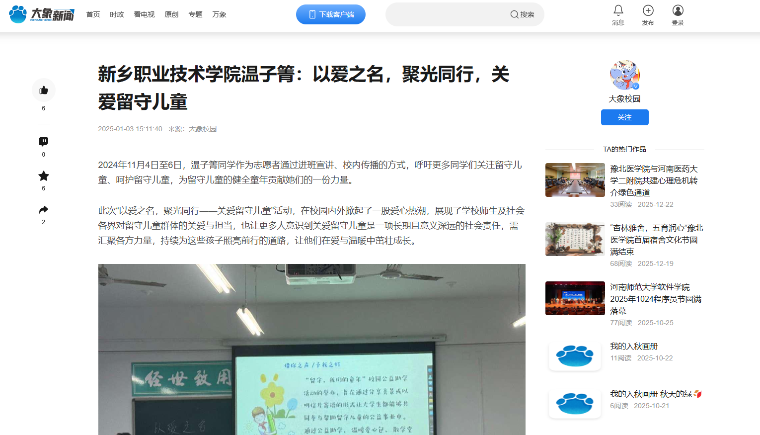 【大象新闻】新乡职业技术学院温子箐:以爱之名,聚光同行,关爱留守儿童