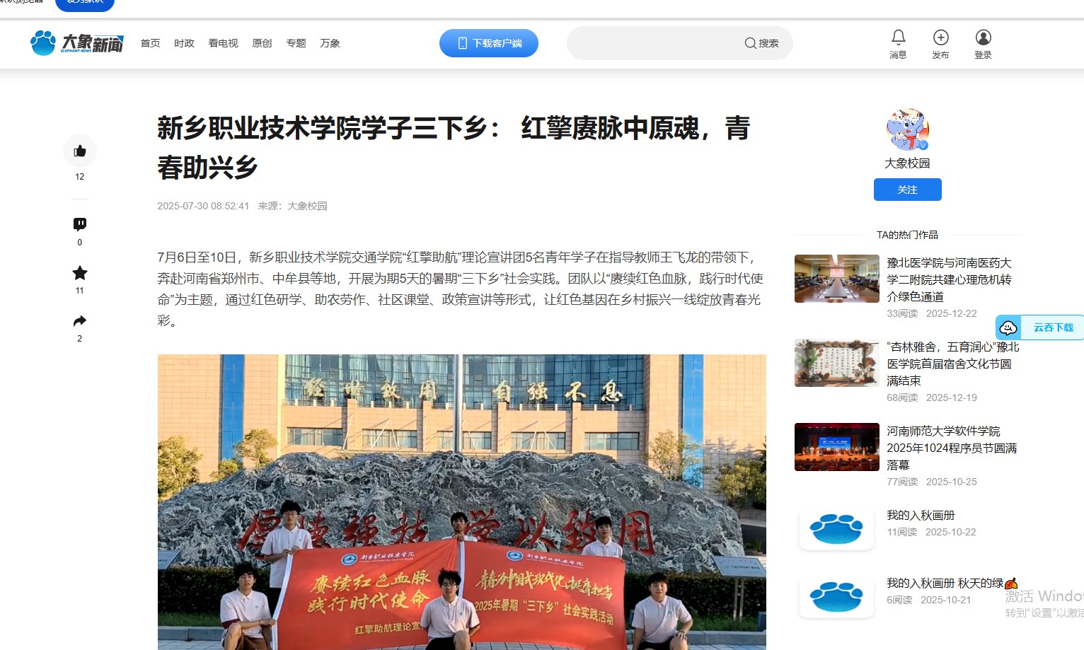 【大象新闻】新乡职业技术学院学子三下乡: 红擎赓脉中原魂,青春助兴乡