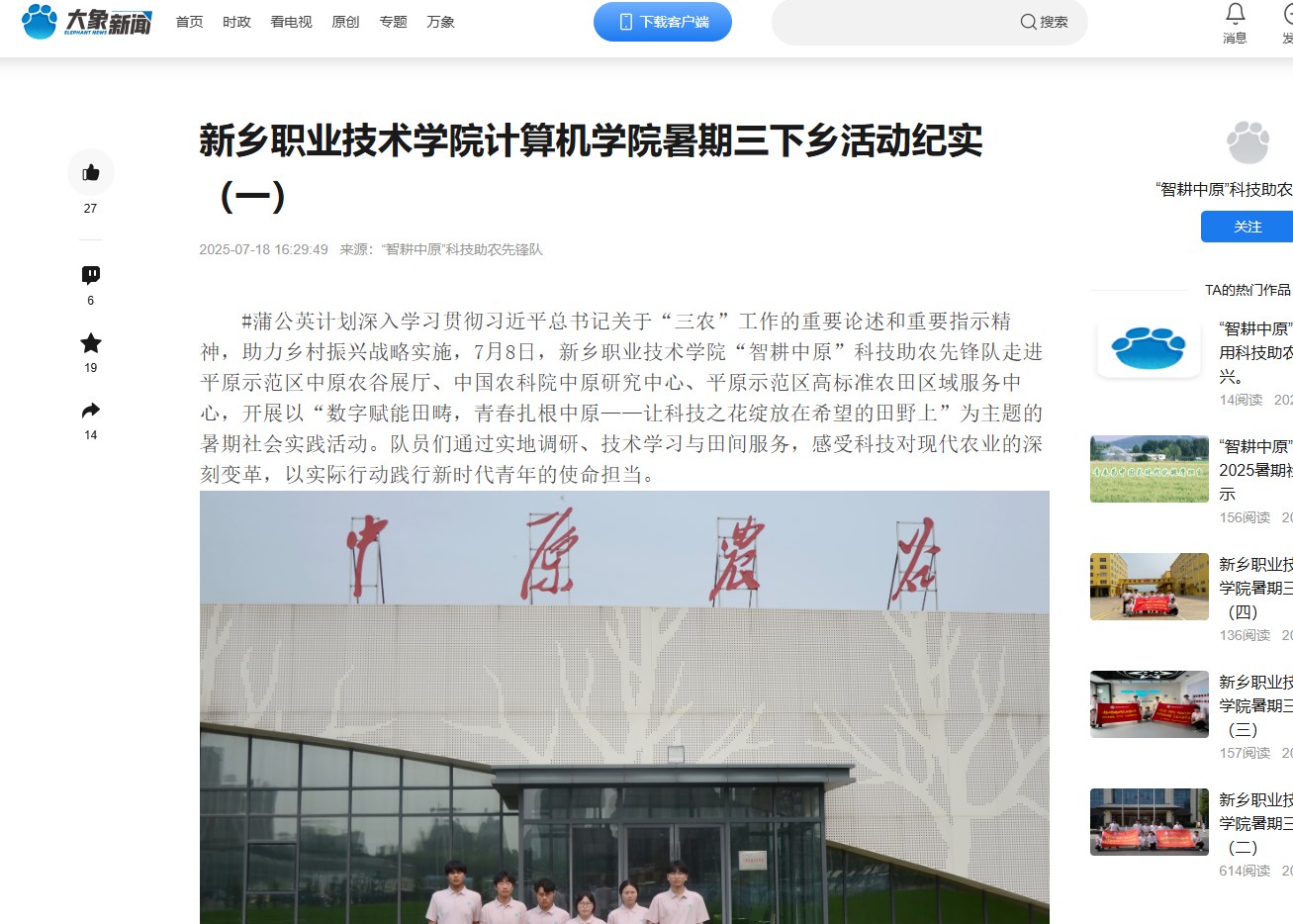 【大象新闻】新乡职业技术学院计算机学院暑期“三下乡”社会实践活动纪实(一)