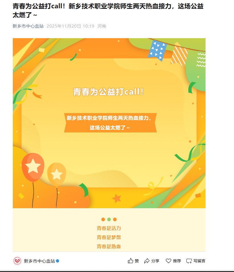 【新乡市中心血站】“奉献热血,守护生命”新乡技术职业学院师生两天热血接力