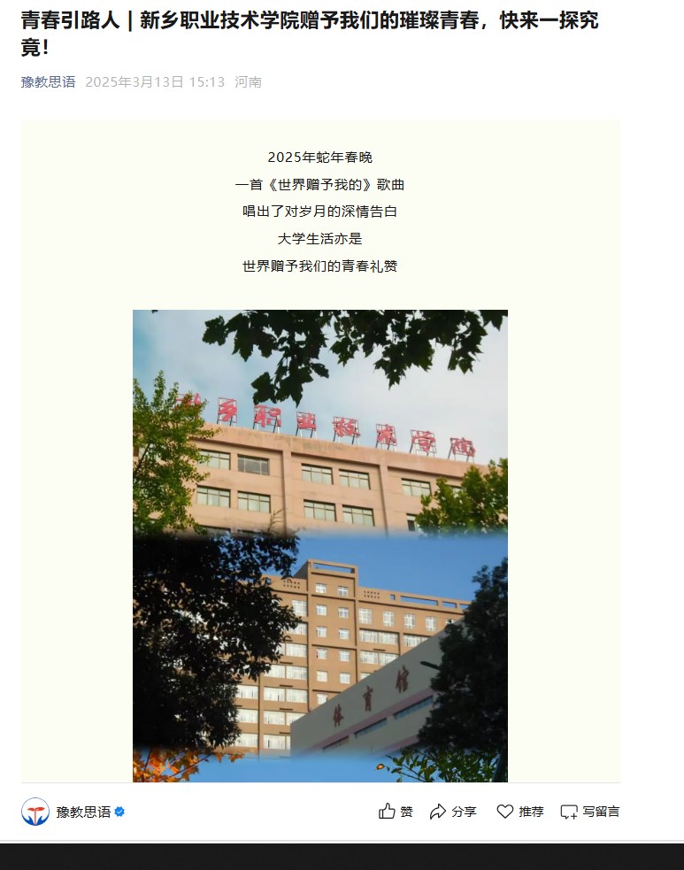 【豫教思语】青春引路人 | 新乡职业技术学院赠予我们的璀璨青春,快来一探究竟!