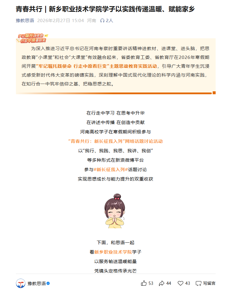 【豫教思语】青春共行 | 新乡职业技术学院学子以实践传递温暖、赋能家乡