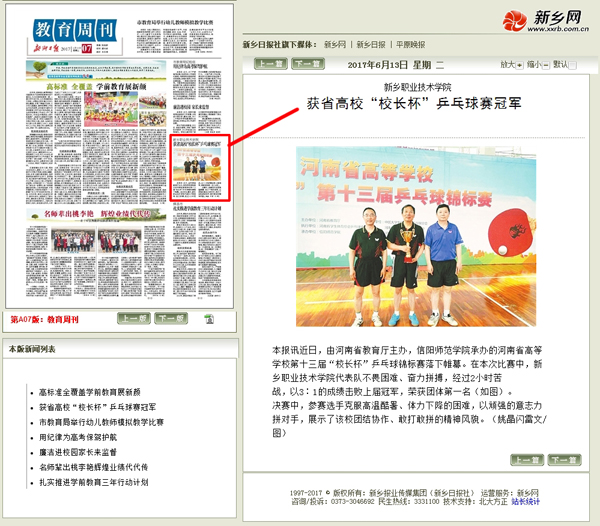 获省高校“校长杯”乒乓球赛冠军 ----《新乡日报》2017年6月13日