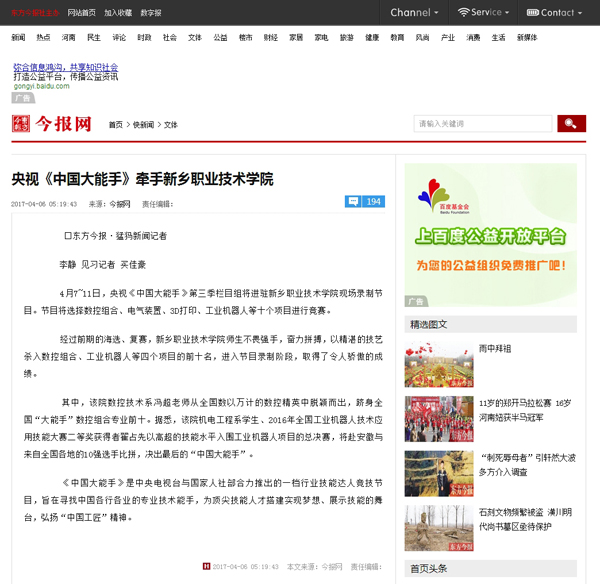 央视《中国大能手》牵手新乡职业技术学院---《东方今报官方网站》2017年4月6日