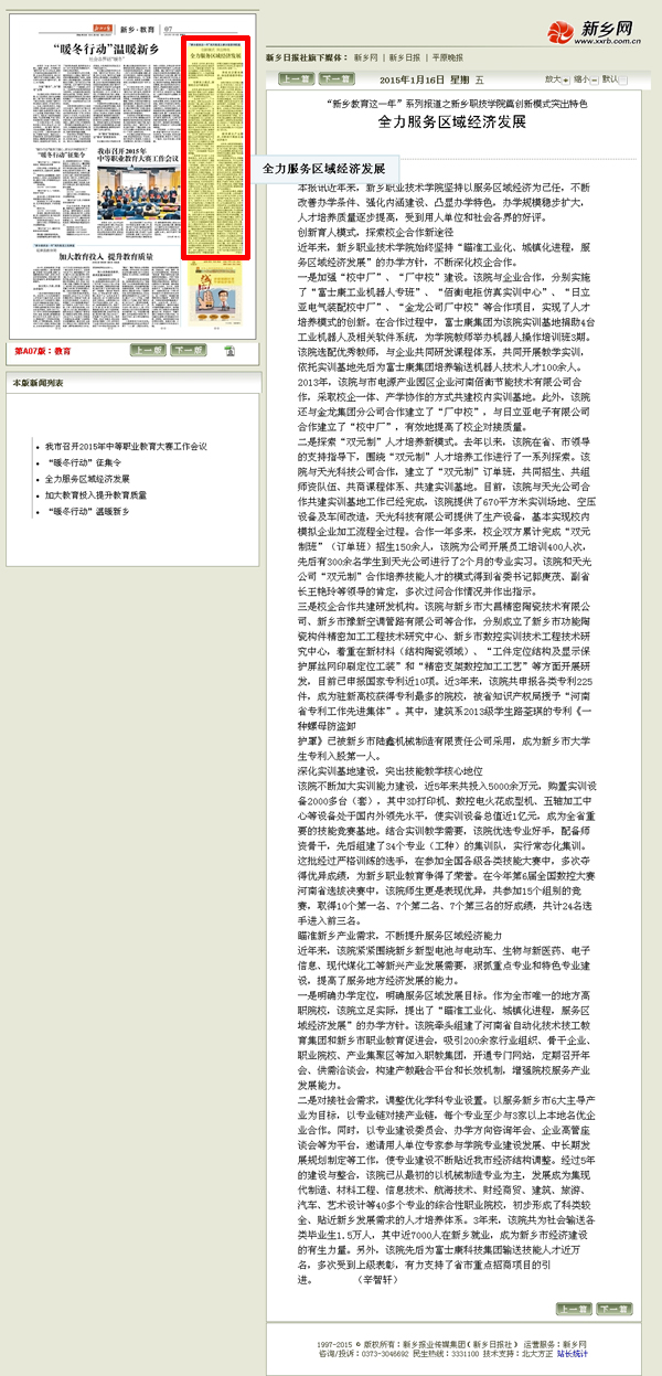 全力服务区域经济发展《新乡日报》2015年1月16日A07版