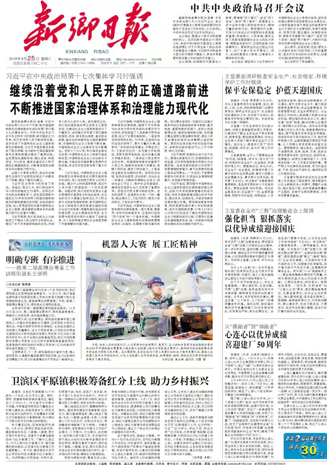 机器人大赛 展工匠精神---《新乡日报》第一版2019年9月25日