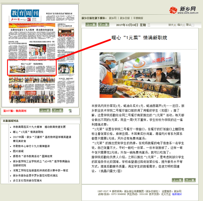 暖心“1元菜”情满新职院 ---《新乡日报》2017年12月19日