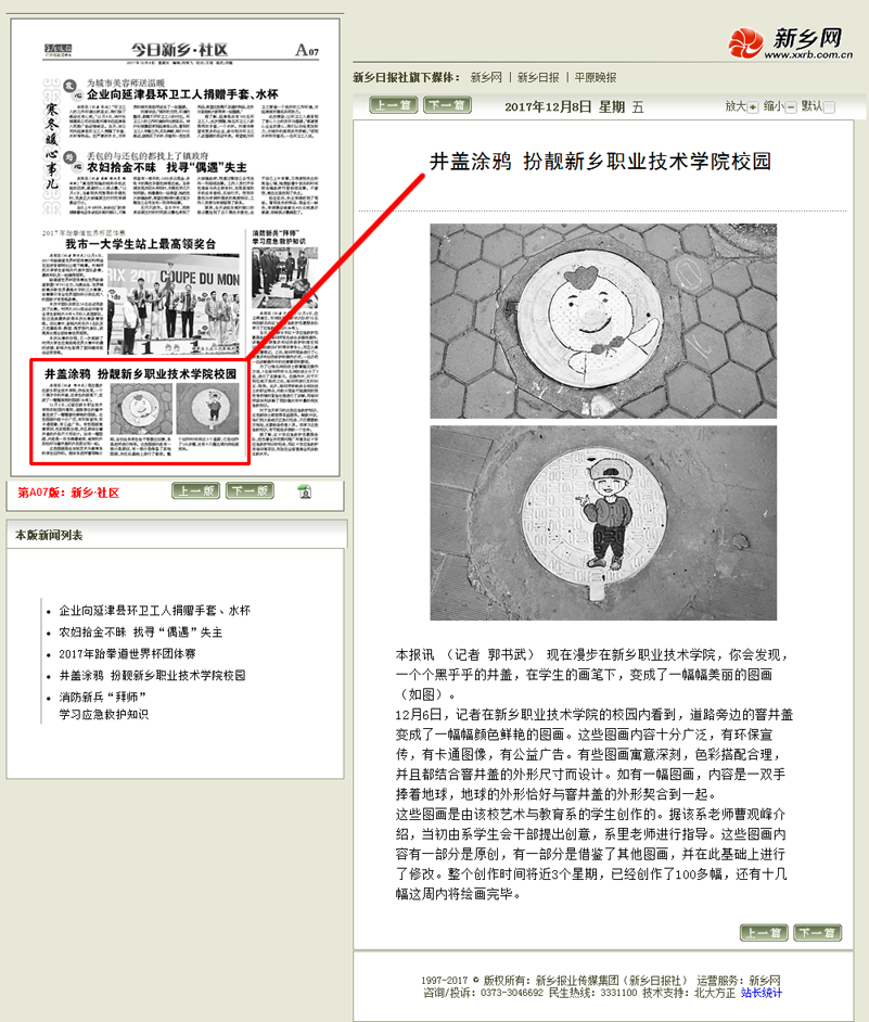 井盖涂鸦 扮靓新乡职业技术学院校园----《平原晚报》2017年12月8日