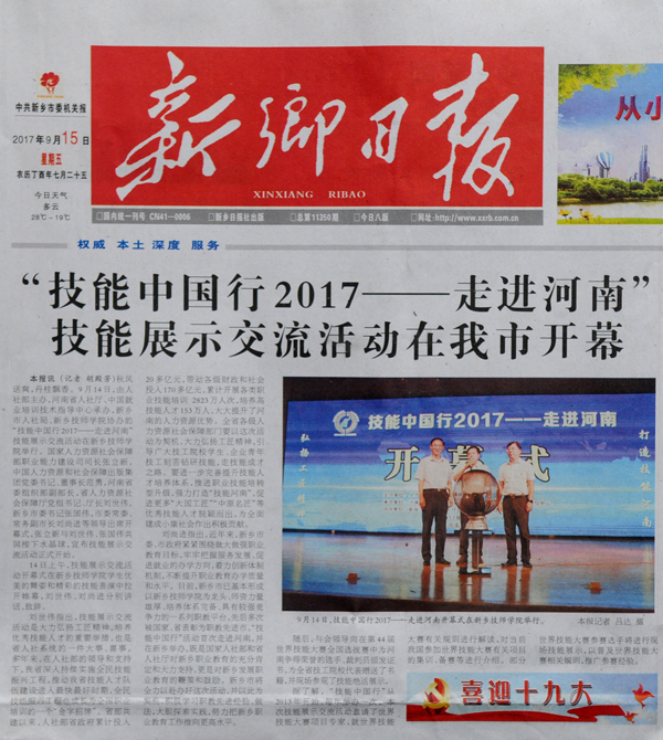 “技能中国行2017——走进河南”技能展示交流活动 在我市开幕----《新乡日报》2017年9月15日