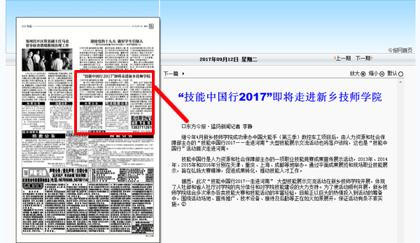 “技能中国行2017”即将走进新乡技师学院---《东方今报数字报刊平台》2017年9月12日