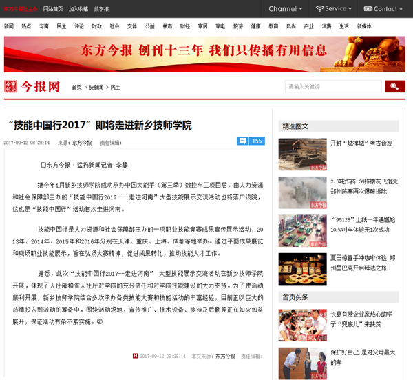 “技能中国行2017”即将走进新乡技师学院 ----《东方今报官方网站》 2017年9月12日