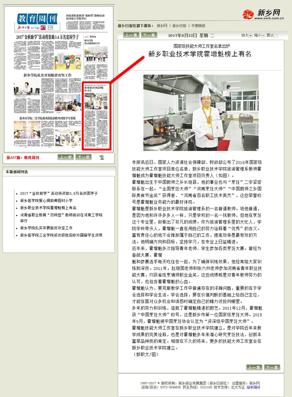 新乡职业技术学院霍增魁榜上有名 ----《新乡日报》2017年8月22日