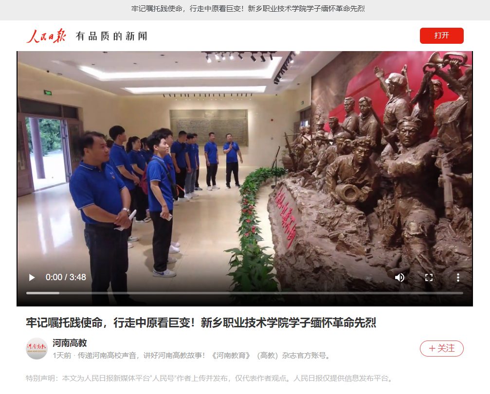 人民日报 | 牢记嘱托践使命,行走中原看巨变,新乡职业技术学院学子缅怀革命先烈