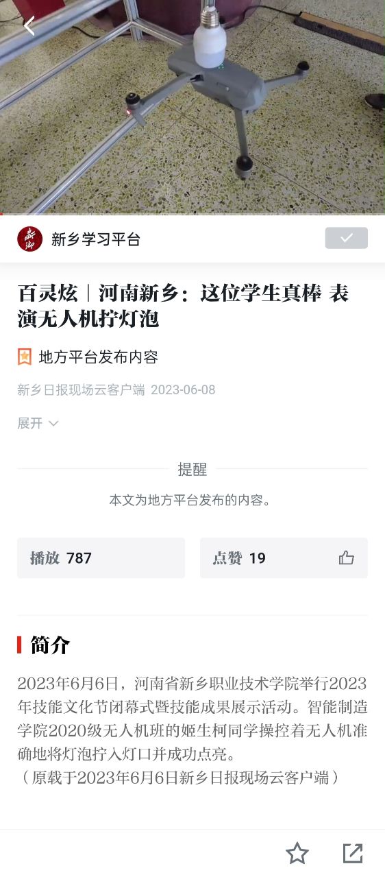 学习强国 | 河南新乡:这位学生真棒 表演无人机拧灯泡