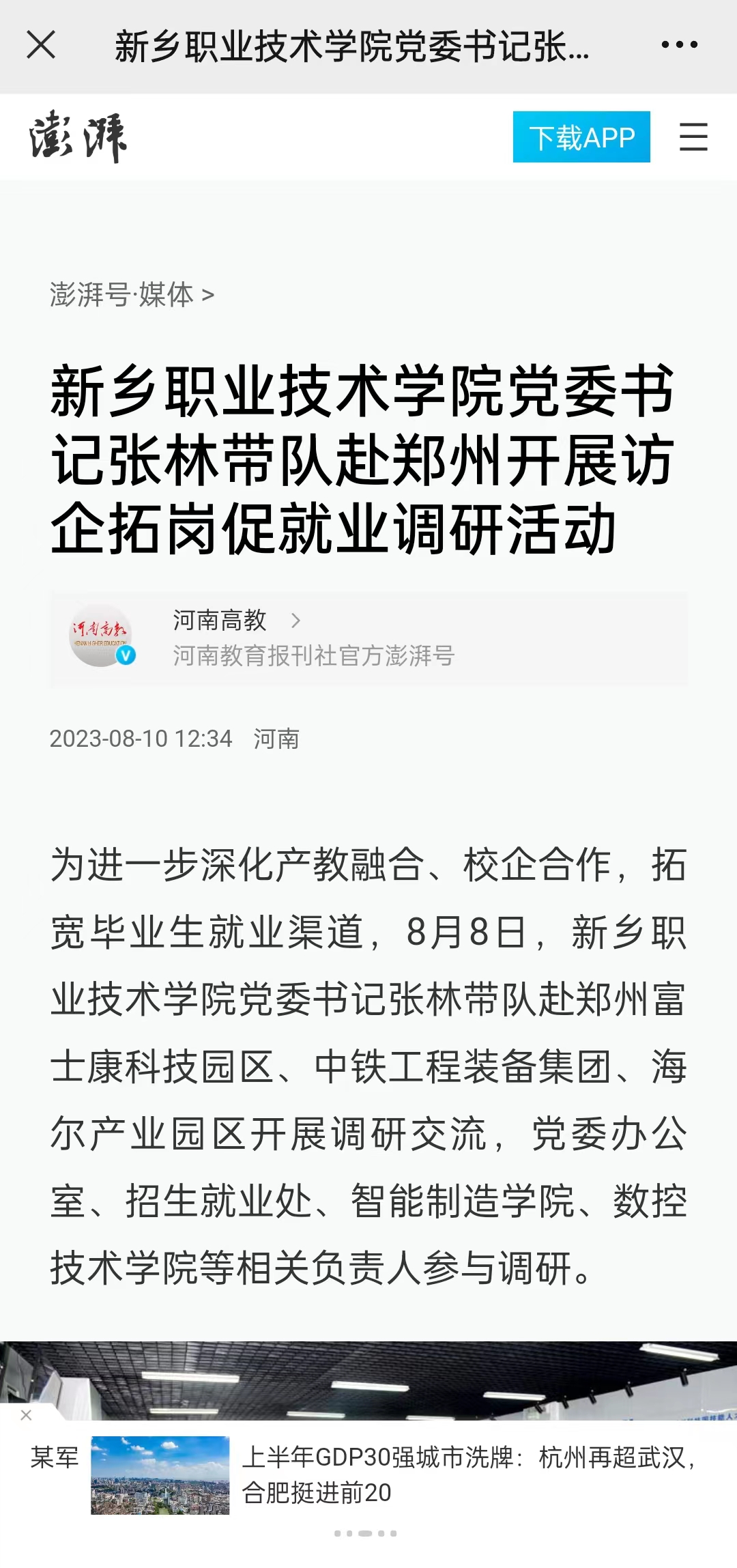 【澎湃新闻】新乡职业技术学院党委书记张林带队赴郑州开展访企拓岗促就业调研活动