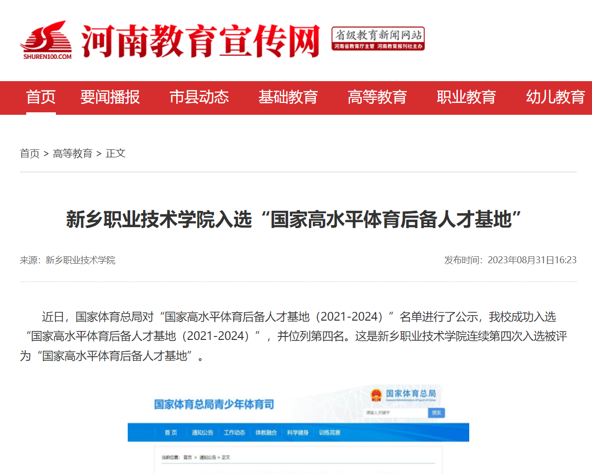 【河南教育宣传网】新乡职业技术学院入选“国家高水平体育后备人才基地”