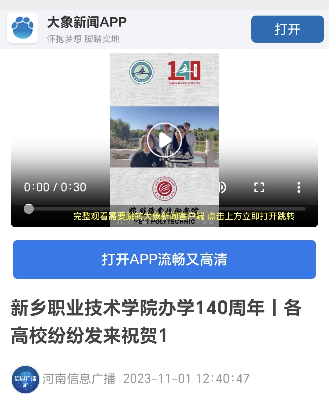 【河南信息广播】新乡职业技术学院办学140周年丨各高校纷纷发来祝贺1
