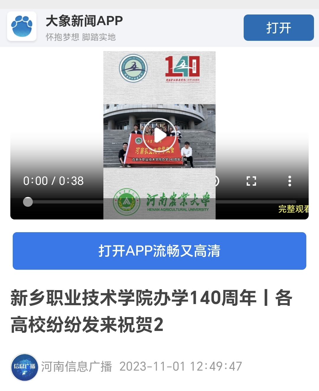 【河南信息广播】新乡职业技术学院办学140周年丨各高校纷纷发来祝贺2