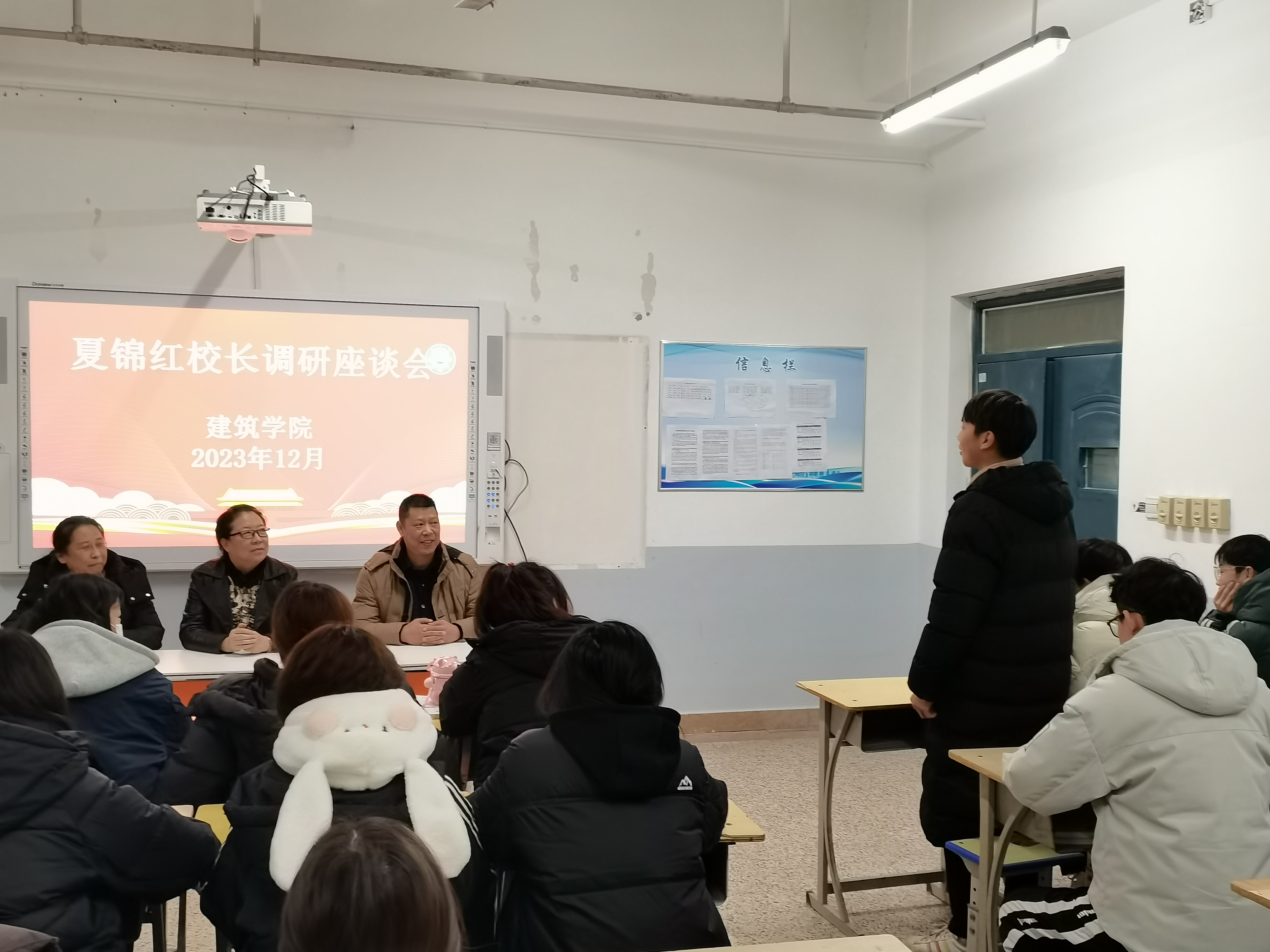 为深入推进学习贯彻习近平新时代中国特色社会主义思想主题教育走深走实。近日,校长夏锦红在建筑学院党总支书记夏莹、院长郑学工的陪同下,召开联系班级调研座谈会。